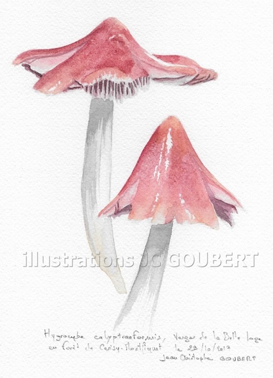 L'Hygrocybe calyptraeformis, un des plus beaux champignons que je connaisse. Trouvé cet après-midi, peint ce soir :