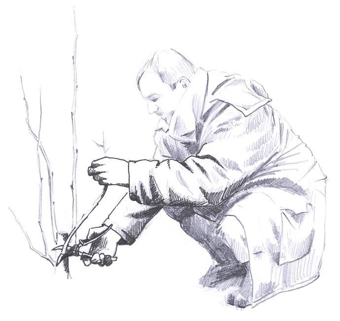 Recépage : dessin à l'encre et au crayon pour le guide les "essenc'ielles". Guide pour l'entretien, la plantation et la connaissance des haies bocagères édité par le Parc Naturel Régional des marais du Cotentin et du Bessin.