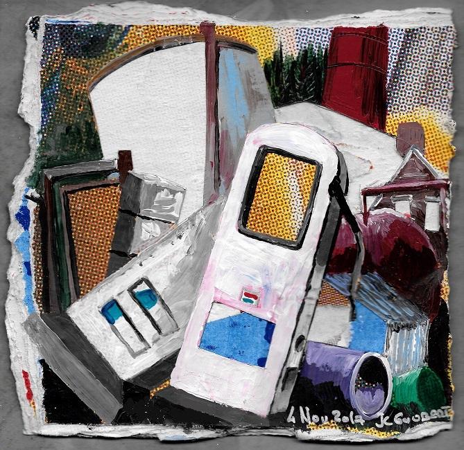 Géraldine ; Géraldine en approche : acrylique et découpage, évocation du brouillard suivant les camions sur route mouillée.
