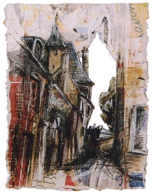 Etudiant aux Beaux-Arts à Cherbourg, je suis tombé en rentrant des cours sur une grande affiche que son poids et les intempéries avaient fait tomber dans une friche. J'ai d'abord été impressionné par sa taille, et les possibilités de créations mégalomaniaques qu'une telle surface offrait. Le papier et la colle s'y étant accumulés pour faire une couche épaisse et rigide. A force d'expériences, j'ai découvert les richesses de ce matériau formidable : envers blanchâtre, sali, taché, déchiré, où apparaissent par transparence des couleurs et des motifs... Je le travaille par le dessin, la peinture, le collage, le décollage : je découpe des plages, y retranche des couches pour laisser apparaître le motif ou la couleur cachés dessous, afin que la matière et le hasard participent à la création.